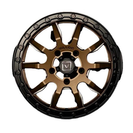 The VALOR OFFROAD V15 Satin Black Beadlock Wheels come in a 15x7 Size for 5x114.3 (5x4.5) Bolt Pattern. The satin bronze paint finish on the Valor Offroad V15 was developed to change colors. In dim light, you'll see copper highlights, while in brighter conditions, the satin bronze will have more of a metallic tin color.