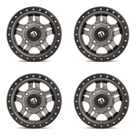 The Fuel UTV D558 Anza ATV UTV Wheels come in 14x7, 15x7, 15x8 and 15x10 Sizes for 4/137, 4/156 and 5/4.5 5/114.3 bolt patterns to fit most ATV UTV SxS models. The Fuel D558 Anza Wheel has a Gun Metal Finish with a Black Bead Lock Ring and this wheel is load rated for 1000 lbs. in both sizes.