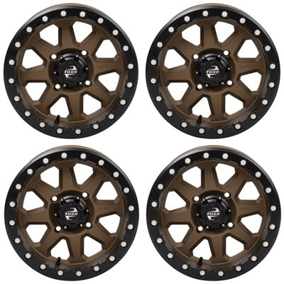 The Tusk Uinta Bronze Beadlock ATV UTV Wheels come in 4/137 and 4/156 bolt patterns in 14x7 and 15x7 inch sizes to fit many ATV and UTV models. The Tusk Uinta is a cast aluminum wheel with a forged aluminum beadlock ring for light weight and maximum strength. 1200 lb load rating for durability. Screw on center cap included.
