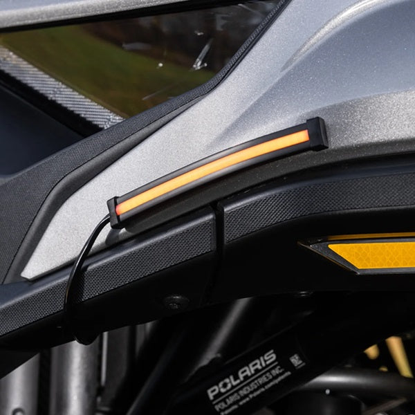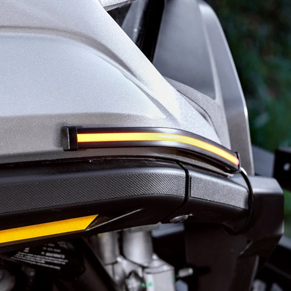 This turn signal kit includes four amber-colored LED indicator lights—two for each side on the front of your machine. And it syncs up with your OEM taillights to turn them into turn signals.