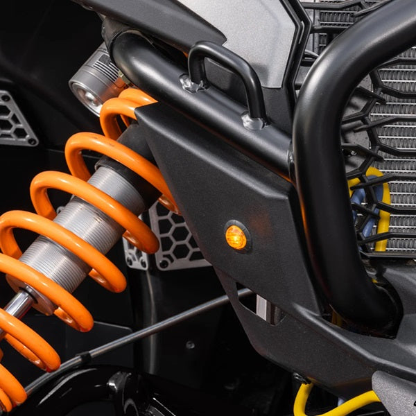 This turn signal kit includes four amber-colored LED indicator lights—two for each side on the front of your machine. And it syncs up with your OEM taillights to turn them into turn signals.